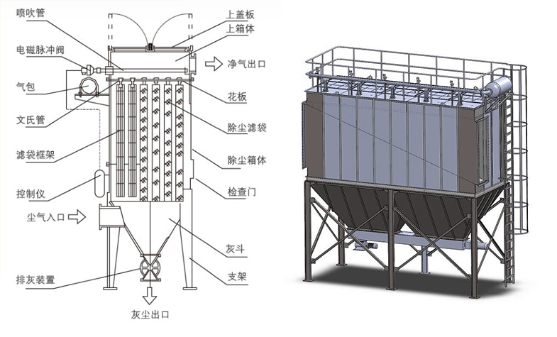 含塵氣體在引風機吸引力的作用下進入灰斗,經導流板后被均勻分配到各條濾袋上。粉塵被攔截在濾袋外表面,氣體則穿過濾袋,經過凈氣室后外排。