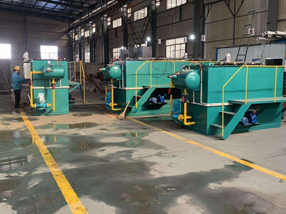 溶氣氣浮機采用新型高效的溶氣設備——微氣泡發生器,代替傳統的引氣設備向水中溶氣,并在氣浮區域內安裝若干斜管組,包括箱體、刮渣機、螺旋出料機共同組成一個完整氣浮凈水裝置。理論上講,氣浮的處理效果與停留時間是沒有直接聯系的,而只與氣浮面積有關,如果將水深H的氣浮區減少為水深H/10,那么氣浮距離和停留時間都將縮小10倍,這就是著名的“淺池理論”。氣浮區加入斜管的目的是增大氣浮面積,大大降低了雷諾系數,使氣浮避免在紊流狀態下進行,制造良好的層流狀態,達到淺層氣浮的效果。